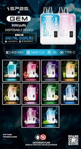 SP2S GEM 9000 口拋棄式電子煙,內建大容量油艙與升級霧化芯,單支可抽約 9000 口。多款水果、冰感、飲品風味可選,口感濃郁順滑,煙霧細膩綿密。免加油免充電,開盒即用,方便攜帶。